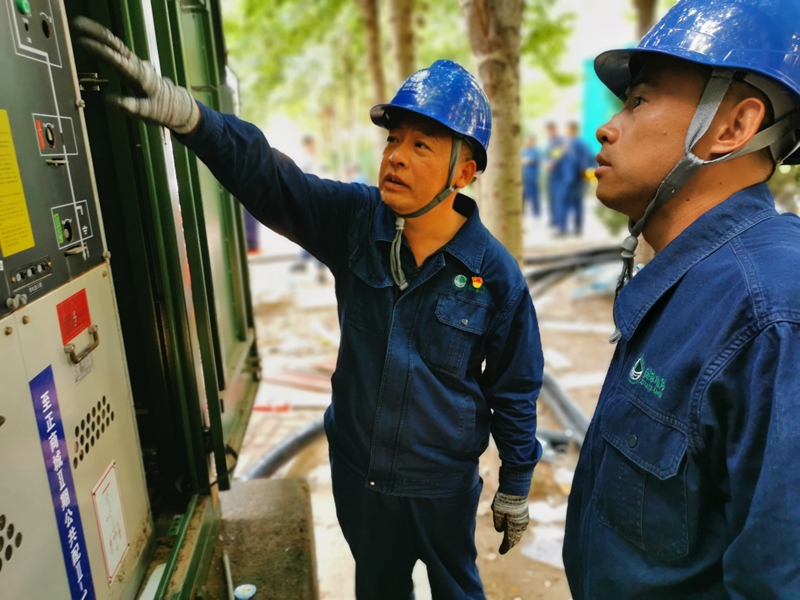 7月25日下午16时,刘洋与抢修队员们来到了郑州市凤凰城小区,开始了紧张有序的抢修工作。彼时郑州的室外温度已经达到了33℃,冒着高温和潮湿,大家开始对小区里的电力设备进行抢修工作。为了防止有人中暑,刘洋时常提醒身边的人休息一会儿,自己却始终忙碌在现场的各个角落,几个小时过去,他放在手旁的矿泉水始终没来得及拧开喝一口。半夜1点半,现场的变电抢修工作终于完成,刘洋和同事们还未能歇口气,就接到了指令,明早6点,赶往新乡市进行支援!
