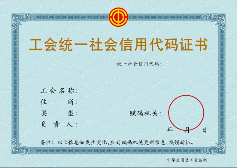 工会统一社会信用代码证书样式